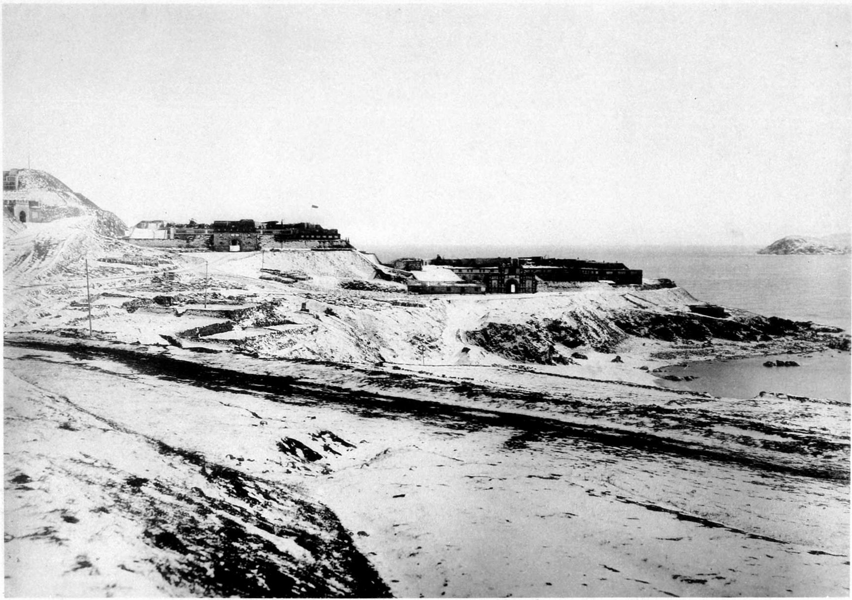 1895年1月20日凌晨3点,黢黑的海上,作为日军首批19艘运输登陆船队的前卫,自大连湾出发的日本联合舰队护航先遣舰八重山、摩耶、爱宕、磐城首先到达成山头海域,借助成山头灯塔明暗闪烁有序的灯光,四舰转向西南再向北,折入荣成湾。 四舰未熄火,八重山、摩耶、爱宕三舰吊下舢板。三艘舢板上,除各有七至八名桨手,另各有陆军士兵,任务只有两项——切断电报线、侦察。 日舰慢速发动机的沉响,穿透冷寂的冬夜,引起了巩军哨兵的警惕,三艘划浪而来的舢板证明来者不善。合衣宿营的巩军迅速展开,一路奔向海滩,在埋入沙滩的渔船之间散开。6点45分,天已朦朦亮,大雪纷飞。八重山舰舢板先靠岸,埋伏在渔船后的巩军开枪,纷乱无准的弹雨中,一颗子弹击穿八重山舢板的船头右舷板。 日军仓皇回撤,一边用舢板上的速射炮还击,一边施放火箭信号召唤火力支援。八重山、摩耶、爱宕、磐城炮火齐射,巩军的4门野战炮只发射了两颗炮弹就被放弃。200余名巩军溃散、四门75毫米野战炮被缴获,此后直到1945年,50年中造化毓秀的龙须岛再无如此多而装备齐全的中国海防军队。上午9点,日军后续大队运船和护航编队已到达一个多小时,日军舢板二次出发,此后登陆异常顺利。 1月20日上午10时,19艘日本运兵船开始冒雪过驳作业。军舰放下小火轮拖带总共308艘驳船,日军及物资陆续上岸。 首批入侵的日军携带了一种特殊武器——照相机。甲午之战,日军战斗编制中除大炮、村田步枪,还有参谋本部直属陆地测量部的照相机,清军则一架也没有。几块玻璃片子,一堆细琐的金属零件,再加上几个木头箱子,几瓶药水,中无日有之间,正是两个政府、两个社会软实力的巨大差距,也从细处暴出中国洋务运动“引进国外先进技术,西学为用”之于整个社会的价值到底几何,显露出两国软实力的高下。 甲午战争时的相机很笨重,不像现在这样轻便。首先是木制暗箱很大,其次底片都是毛玻璃,拍摄者往往需要两个或以上的助手,一人背底片,一人背暗箱,甚至还有定影、显影水。以1894年10月24日跟随大山岩第2军登陆花园口,活动于辽东战场的所谓日本摄影家龟井兹明为例,1894年10月16日,他从宇品港搭乘横滨丸出发时携带的摄影器材就重约一吨,装了11个大箱子,带了5个仆人、助手。 龟井兹明是贵族志愿者,直属日本陆军参谋本部的测量部写真班则是日军编制内的战斗人员,这个小单位的战斗费效比肯定低于同人数的步兵、骑兵,摄影班的武器是相机。较之于一杆枪、一门炮的瞬时杀伤力,一架相机的战斗力是持续甚至永远的,一次快门之后,可以反复无数次地复制、传播、迸发这种力量——煽动、蛊惑乃至诱惑。 携带当时还非常笨重的摄影器材,记录甲午、乙末之年这场“倾国一战,以成族运”的侵略战争,从一开始就透露出日本政府甚至民间个人的自信,这种自信不是一时的虚妄,而是来自系统而深度的情报逻辑,比如关文炳之流的“视察”。这种自信从日军登陆出发的顺序安排都可窥一斑。作为非战斗部队,日本参谋本测量部摄影班乘坐第一批运兵船, 1895年1月20日早晨抵达荣成湾就在船上架起相机拍照片,纪念他们的 “伟大时刻”。 1月21日,龙须岛继续下雪而且还刮起了风,日军陸地測量部写真班技手背着沉重的器材,冒雪登山,站在南岛山的山脊南段,由北向南俯拍了 “榮城竜睡灣ニ於ル船艦碇泊之光景”这张照片。 把南岛山上那块奇形怪状的石头摄入镜头,是整个甲午战争中日军全部战地摄影中的唯一景物照。以此怪石作为大和民族“拓万里波涛,布国威于四方”光辉历史的参照和见证,日军当年的构图用心可谓良苦,纪念大和民族历史的责任感可谓强烈。 (1895年1月21日上午 日本陆军参谋本部陆地测量部 摄)