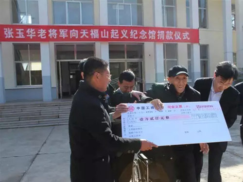 在张玉华的心中,没有小我,而是大家。他将金钱用到了最需要的地方,将力量奉献给了最需要的人们。 我把一切献给党和人民 2015年9月3日,张玉华作为抗战老同志乘车方队成员参加纪念中国人民抗日战争暨世界反法西斯战争胜利70周年阅兵仪式。经过天安门时,张玉华用颤颤巍巍的右手,敬了一个郑重无比的军礼,他的眼睛虽不如昔日明亮,但却饱含深情。这一幕,令无数人热泪盈眶、记忆犹新。 张玉华常说,自己有三个妈妈,第一个是生母;第二个是人民;第三个是党。对生母,自己尽到了责任;对民母,他永远也报答不了,他在战争年代3次重伤,都是在人民群众的细心照料下得以康复;对党母,他的信念是,要永远听党的话,跟党走。他感恩党和人民,只要自己喘着一口气儿,就要为党和人民多做一些事情。 早在2001年,张玉华就写下了遗嘱:“我活着为人民,我的后事也要为人民着想,不向组织提任何要求,不去做于死者无益、于活者有损的事。”他要求死后不举行遗体告别仪式,把有移植价值的器官捐献给国家。2017年9月10日,张玉华将军在南京逝世,享年101岁,按照他生前遗嘱,子女将他的眼角膜捐献给了南京市红十字会眼库,骨灰撒在起义的天福山上。张玉华留给子女的,除了战功赫赫的勋章外,就是在体内留存了77年、直至火化才取出的子弹。 舞剑誓卫国,卸甲时忧民。张玉华朴素的话语、赤诚的情怀,诠释了一名共产党员为中国人民谋幸福、为中华民族谋复兴的初心和使命。老将军虽然走了,却留下了为信仰奋斗的典范、为事业奉献的传承、为人民服务的榜样。他与天福山同在,在天福山永生。 |
